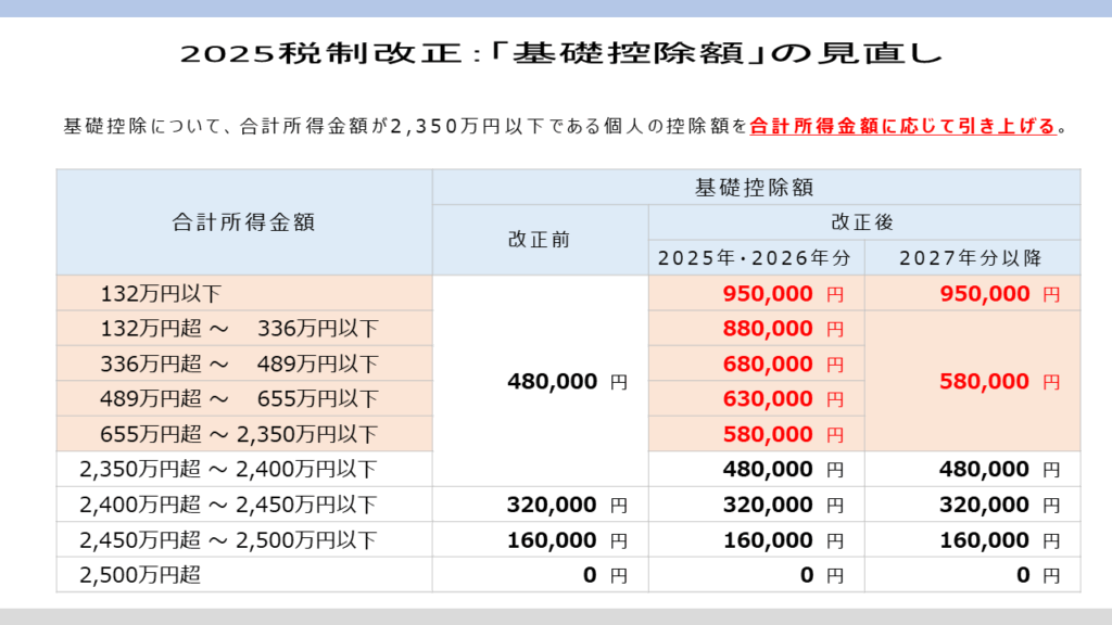 「基礎控除額」は、合計所得金額が2,350万円以下である個人の控除額を合計所得金額に応じて引き上げられます(合計所得金額2,350万円超の場合の基礎控除額は改正なし)。