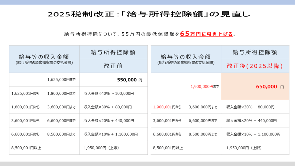 「給与所得控除額」は、55万円の最低保障額が65万円に引き上げられます。