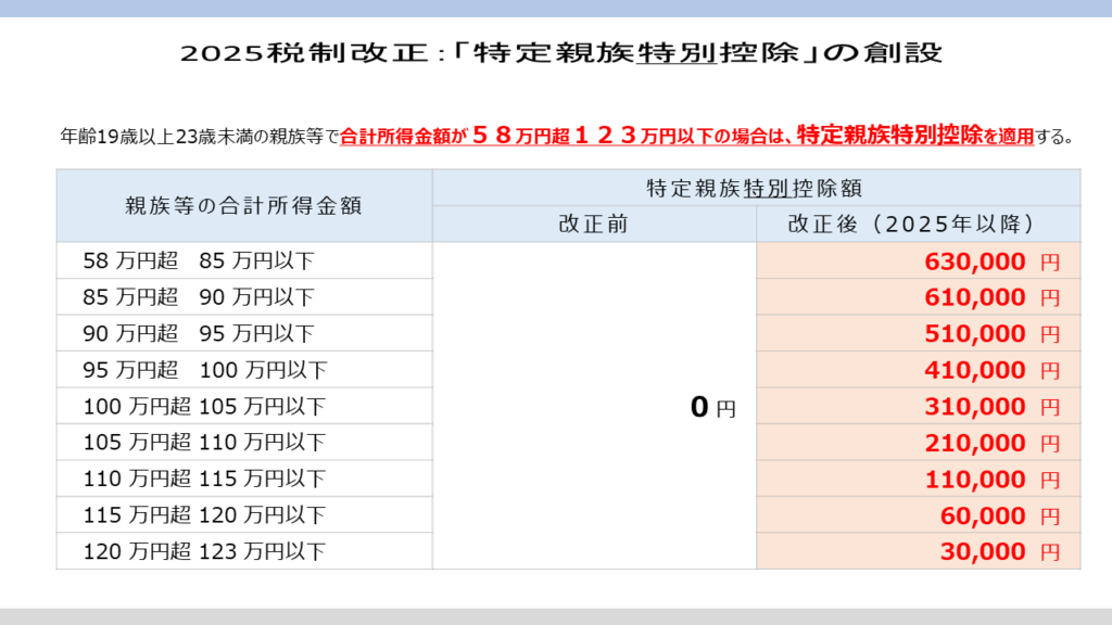 学生等である子の就業拡大を図り、昨今の人手不足を解消することを目的に、2025年度の税制改正では、合計所得金額が58万円を超えた場合でも、親である所得者が所得控除を受けられるよう特定親族特別控除が創設されました。