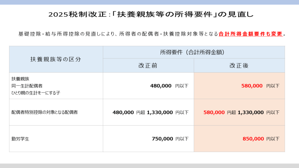 基礎控除額の改正により、配偶者・扶養控除対象等となる合計所得金額要件も変更となります。
