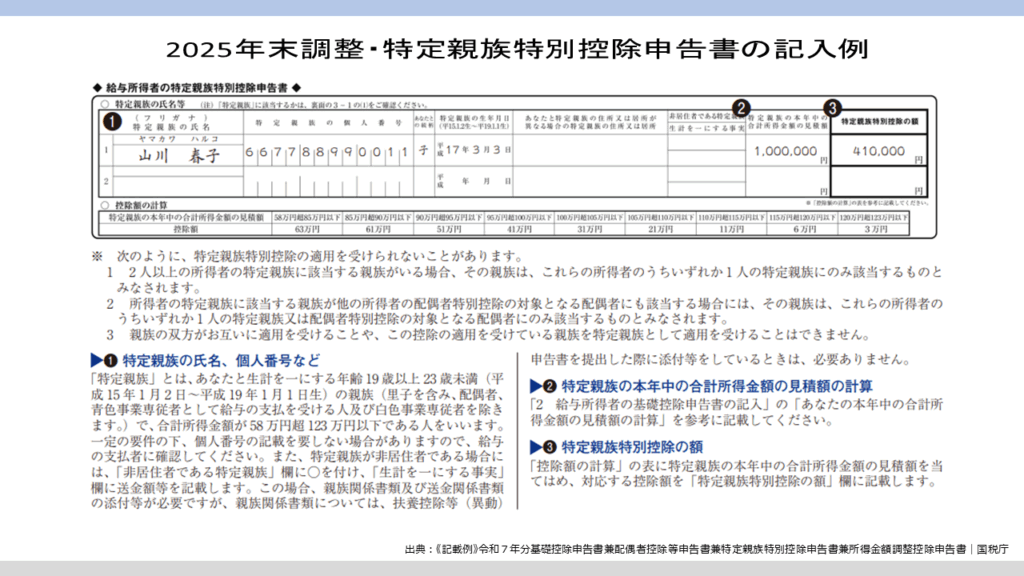 2026年1月以降、控除対象扶養親族と合計所得金額が100 万円以下である特定親族は「源泉控除対象親族」とされます。