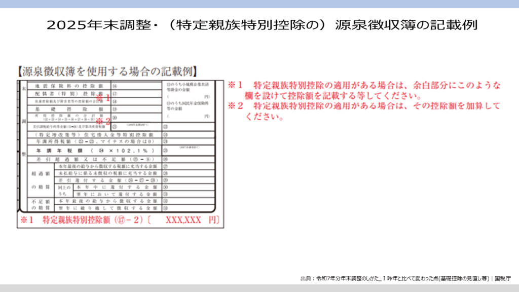 「源泉徴収票」には、特定親族特別控除の額の欄の追加等が行われます。
