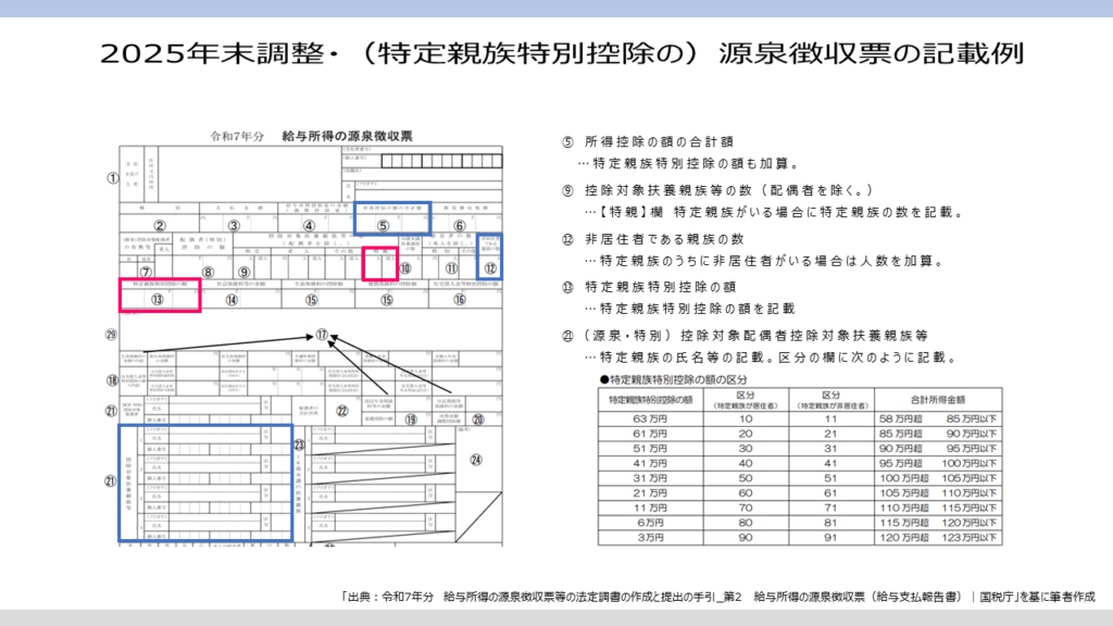国税庁ホームページの「令和7年分給与所得に対する源泉徴収簿」右側の「年末調整」欄は、特定親族特別控除の適用がある場合の計算に対応していません。